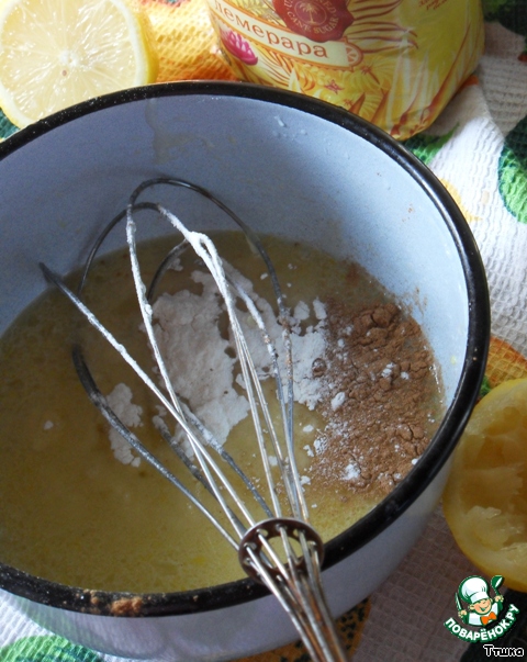 Тем временем приготовить заливку. Два яйца смешать с соком половины лимона. Добавить 200 г меда, 0,5 ч.л. корицы и 1 ч.л. (с горкой) муки, хорошо перемешать.