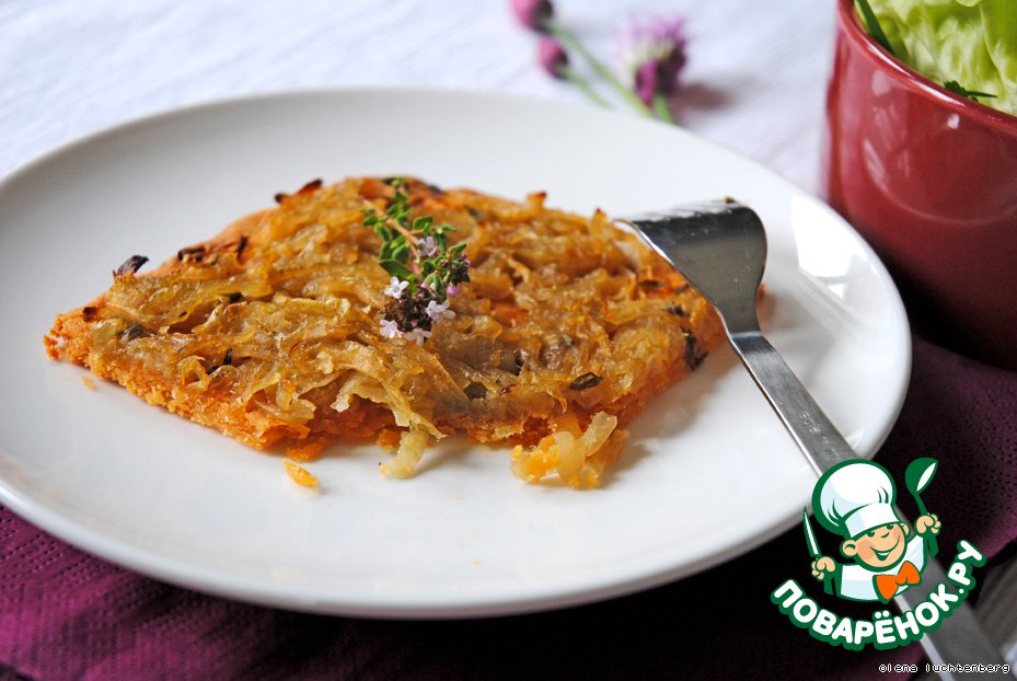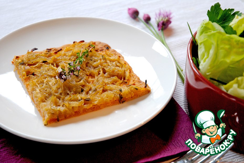 После 10 минут выпечки по тесту распределить ровным слоем лук и выпекать еще 15 минут.