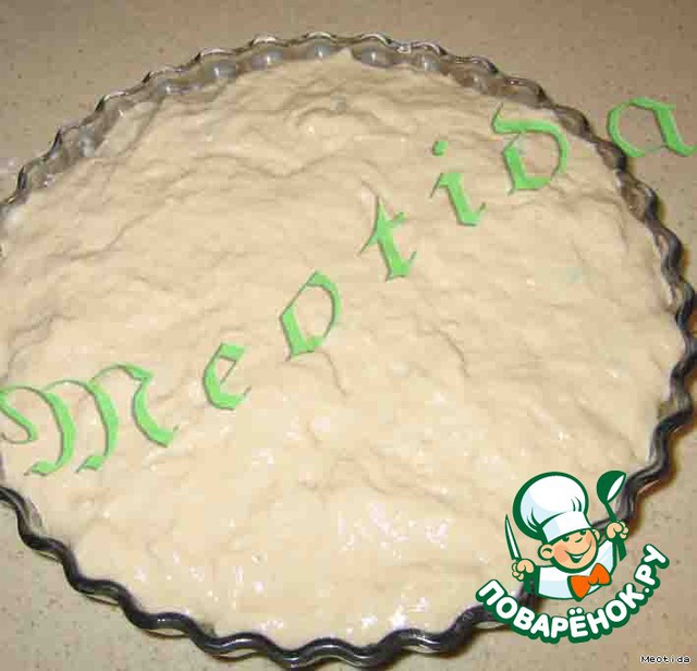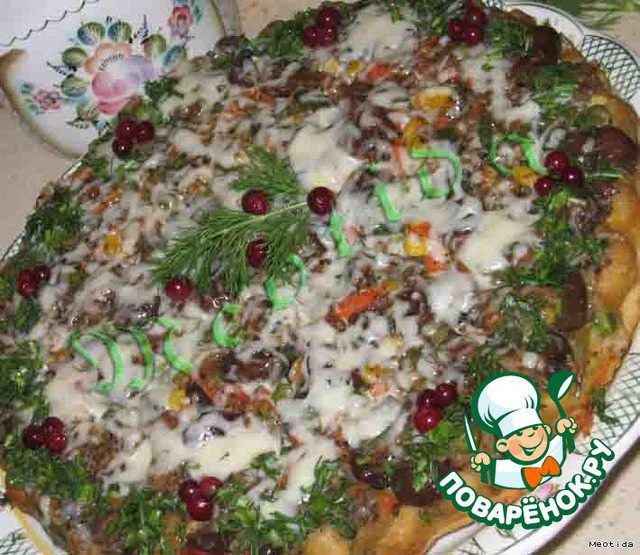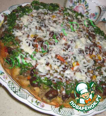 пока пирог горячий посыпаем сверху тертым сыром, измельченной зеленью и...