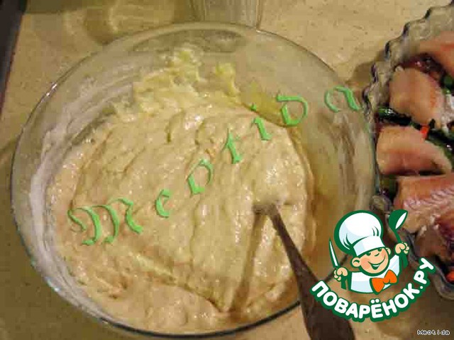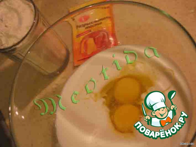 яйца, кефир, 2 щепотки соли, разрыхлитель, хорошенько перемешиваем в однородную массу