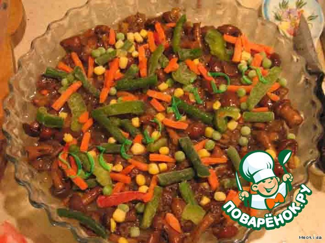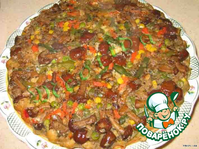 форму хорошенько смазываем маслом, выкладываем слой грибочков, сверху 1 стакан замороженных овощей