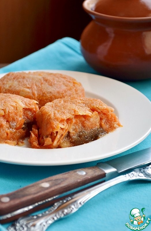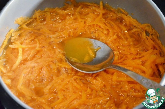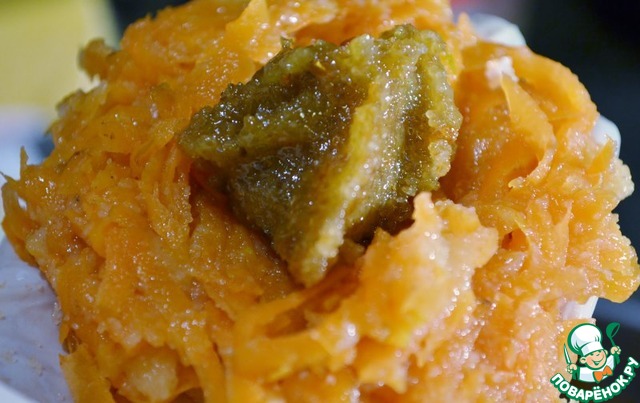 Из получившейся морковной массы сформовать лепёшки, в центр каждой поместить начинку.