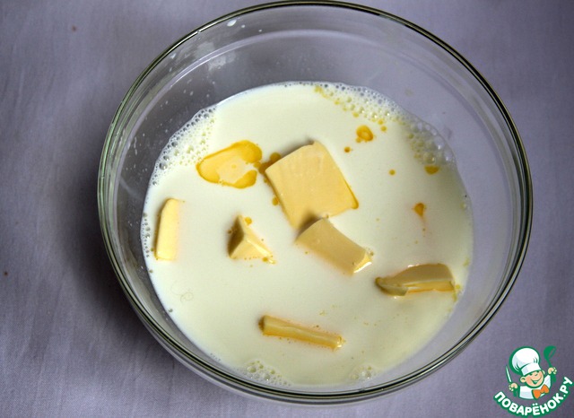 Подогреть 200 мл молока и растворить в нём 75 г сливочного масла.