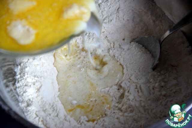 Влить в сухие ингредиенты тёплую молочно-масляную смесь.