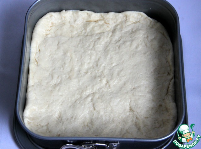По поводу размера формы. Прямоугольная форма с высокими бортами 35 х 22 см (размеры по дну формы) - традиционный вариант. Теста получается очень тонкий слой.
