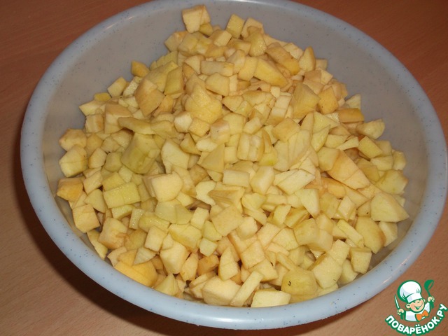 Яблоки помыть, почистить, освободить от семенной коробки и нарезать кубиками.