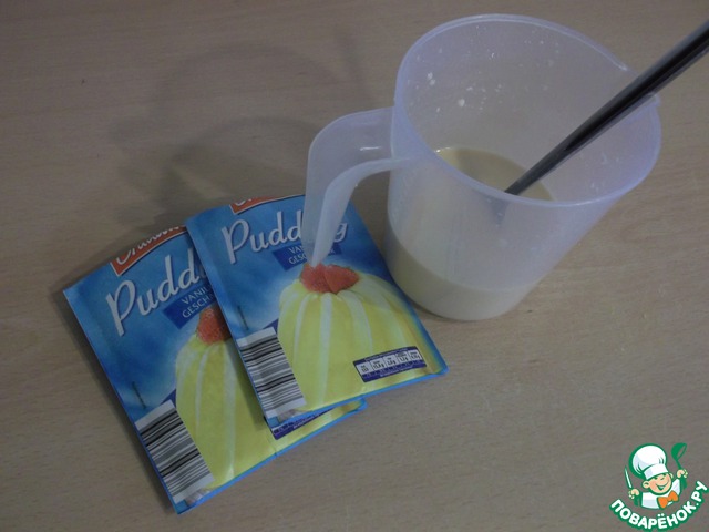 2 пакетика пудинга разводим в 150 мл яблочного сока.