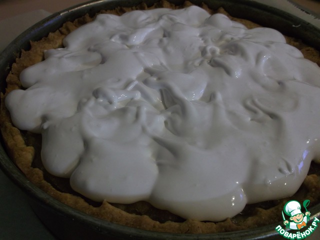 Белки распределяем по верху горячего пирога, делая ложкой пики.