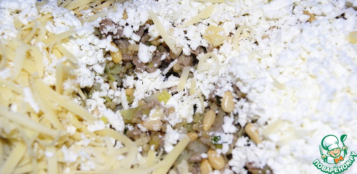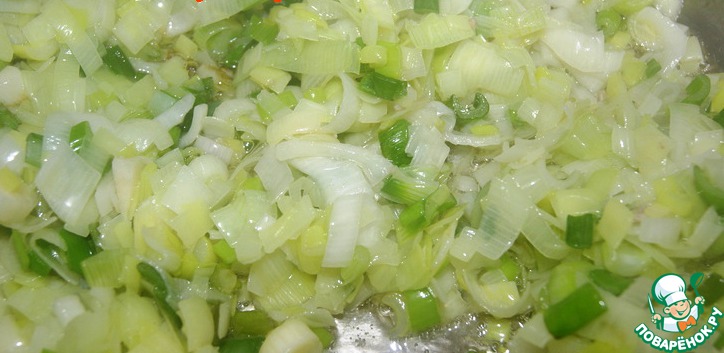 В сотейнике нагреть масло и припустить в нем лук-порей и зелёный 2-3 мин., добавить мясо и тушить 2-3 мин., добавить кускус, влить 100 мл бульона и тушить 5 мин. Снять с огня, остудить.
