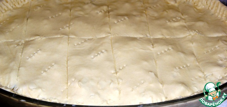 Выстелить 1 частью теста форму так, чтобы были бортики, и равномерно разместить начинку.
