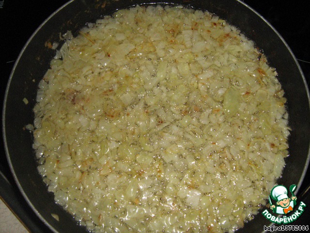 Готовим начинку. Масло разогреваем на сковороде, добавляем мелко нарезанный лук и обжариваем его до золотистого цвета.