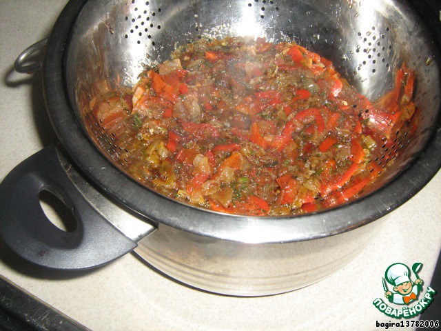 Для теста нам понадобится масло из пассеровки, но оно должно остыть, поэтому овощи выкладываем на дуршлаг, который поставим на кастрюльку, чтобы масло стекло.