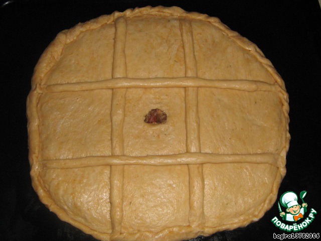 Накрываем вторым пластом, украшаем полосками, смазываем желтком и прокалываем вилкой в нескольких местах, в центре сделать отверстие.
