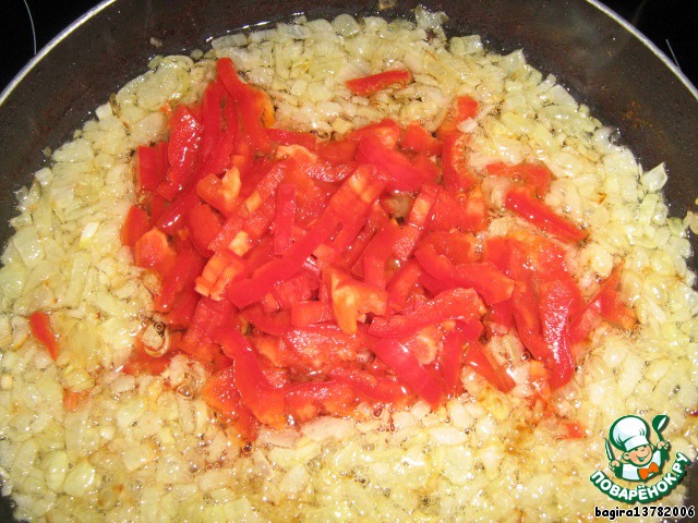 К луку добавляем мелко нарезанный сладкий перец и доводим овощи до полуготовности.