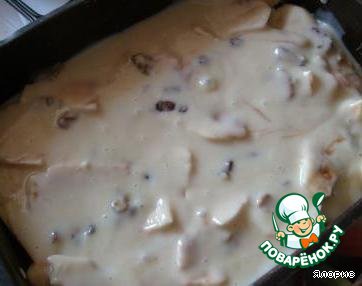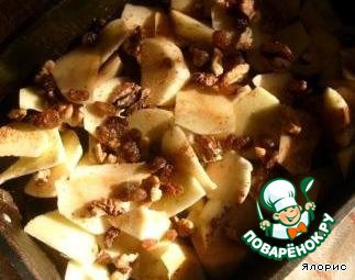 Яблоки чистим, режем на крупные дольки и выкладываем слоем в смазанную форму. Сверху кладем орехи и изюм, присыпаем корицей. Готовим тесто:взбиваем яйца, сахар, майонез, ванилин, цедру, добавляем муку, соду и минералку. Выпекаем шарлотку в горячей духовке. Готовый пирожок должен быть румян и пышен. Посыпаем его сахарной пудрой и подаем на стол. Это вкусное и ароматное блюдо, всегда желанный гость в нашем доме