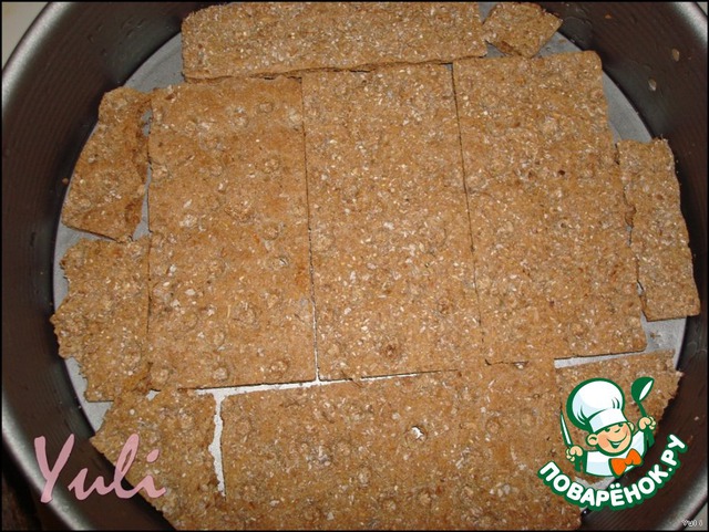 Нагреть духовку до 200С.Хрустящие хлебцы для основы пирога я использовала ржаные,но это дело вкуса.