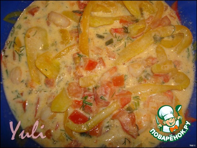 Взбить яйца со сметаной,посолить и поперчить.Подмешать рубленый укроп.Смешать с овощами и креветками.Приправить солью,перцем и лимонным соком.