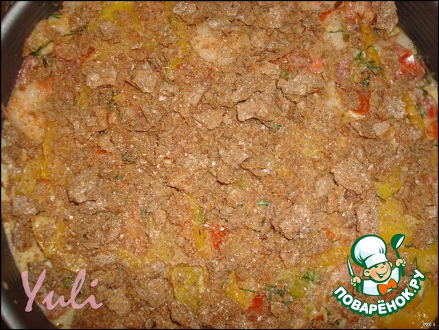 Покрыть сухарики яично-овощной массой.Покрошить оставшиеся хлебцы и посыпать блюдо.Посыпать сыром и запекать 20 мин.