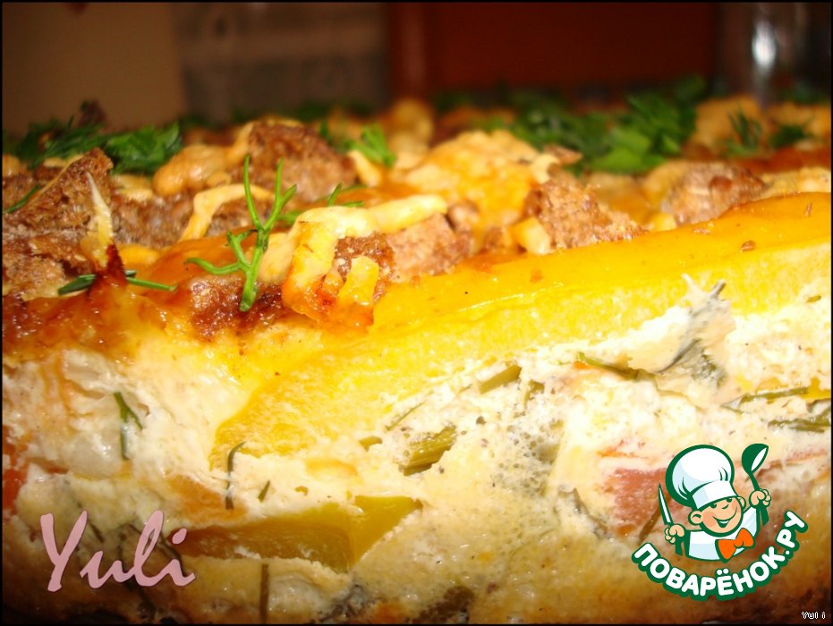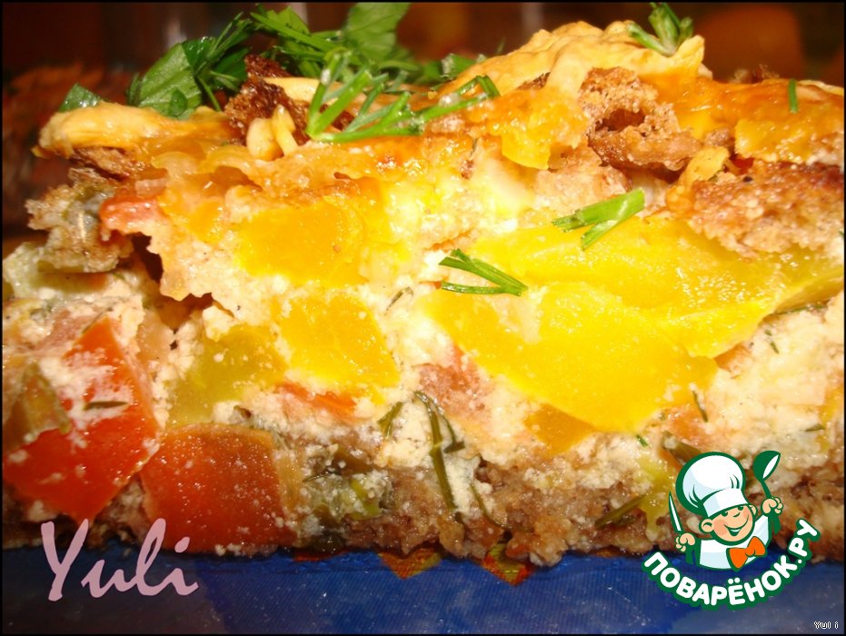 | Сочный,нежный,пикантный пирог с хрустящими ржаными хлебцами.Кому пришелся по душе мой пирог с сыром,зеленью и салом http://www.povarenok.ru/recipes/show/20889/ советую попробовать и этот столь же необычный пирог.Времени на приготовление затрачивается немного,а результат,я надеюсь,не оставит равнодушным. |
