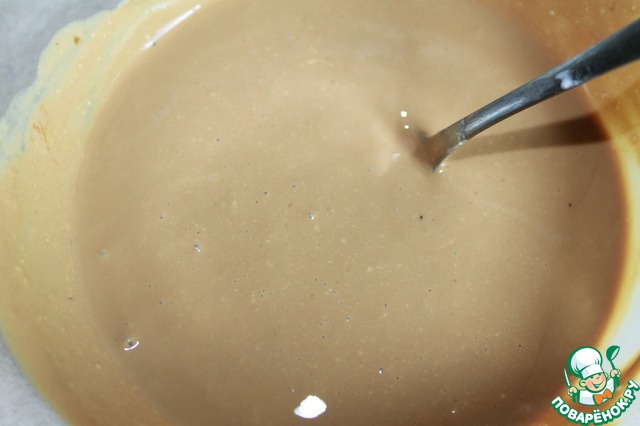В яично-масляную смесь вливаем кофейный кефир, перемешиваем, всыпаем просеянную муку и разрыхлитель. Все хорошо вымешиваем. Выкладываем в смазанную маслом форму и выпекаем при 180 гр. до сухой зубочистки