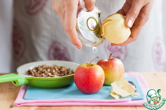 Итак, грецкие орехи мелко порезать и слегка подсушить на сухой сковороде, яблоки очистить, удалить семенную коробочку и нарезать небольшими кусочками, сбрызнуть соком лимона, чтобы не потемнели.
