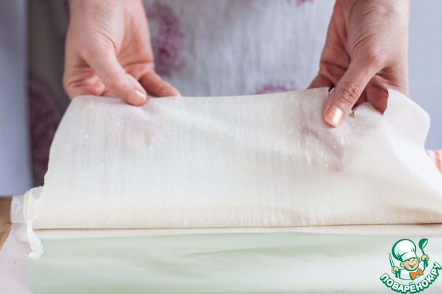 Намочите чистое полотенце, им вы будете закрывать те листы фило, которые не используются, чтобы они не пересыхали. Листы теста фило очень тонкие, похожи на листы бумаги, поэтому сохнут мгновенно.