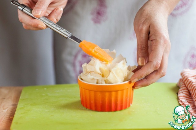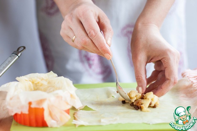 Каждый мешочек положите в рамекин. В каждую форму у меня поместилось по 4 мешочка из фило с яблоками.