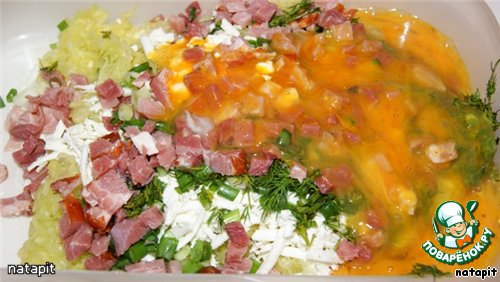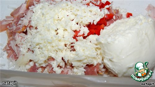 Смешать нарезанную грудинку, 100 гр. красного перца и 50 г моцареллы натёртой на тёрку