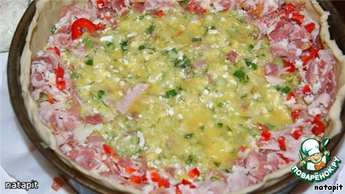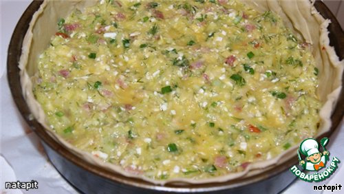 Хорошо перемешать и поместить в форму (26 см в диаметре), в которой предварительно выстелить слоёное тесто сделав высокие бортики.