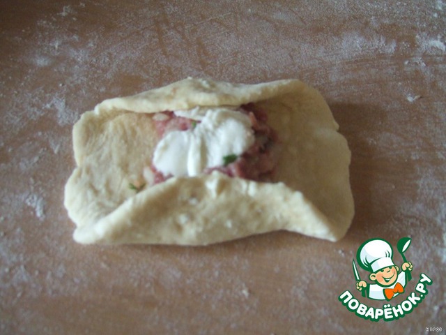 Раскатаем лепёшечку, на середину кладем фарш, и масло сливочное (маленький кусочек).Защипываются они косичкой. Закроем верх и низ пирожка.