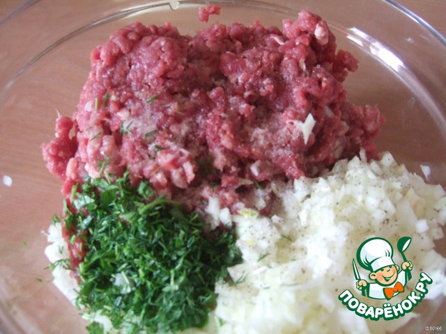 Тем временем займёмся начинкой. Мясо надо мелко-мелко порезать (посечь) ножом. Правда я думаю можно воспользоваться и мясорубкой с крупной решеткой. Мелко-мелко порежем лук. И можно добавить по веточки петрушки и укропа.Луку не жалейте, так как в готовом виде его совсем-совсем не чувствуется, а сок он даёт. Посолим, поперчим. Хорошо вы-мешаем. В некоторых источниках рекомендуют добавить бульон (100 мл.),тогда масло в пирожок не закладывать. Я добавила пару ложечек для сочности, и в пирожок добавила масло.