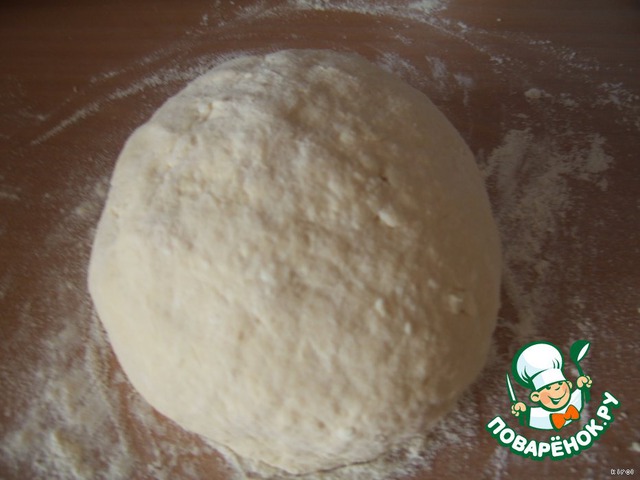 Теперь добавим сметану и муку. Насыпьте сначала 1,5-2 стакана муки, а потом постепенно подсыпайте. Тесто не должно быть крутым. Даже я бы сказала мягкое и немножко прилипает (при лепке пирожков воспользоваться придется мукой). Теперь завернём его в пленку и отправим в холодильник отдыхать :-)