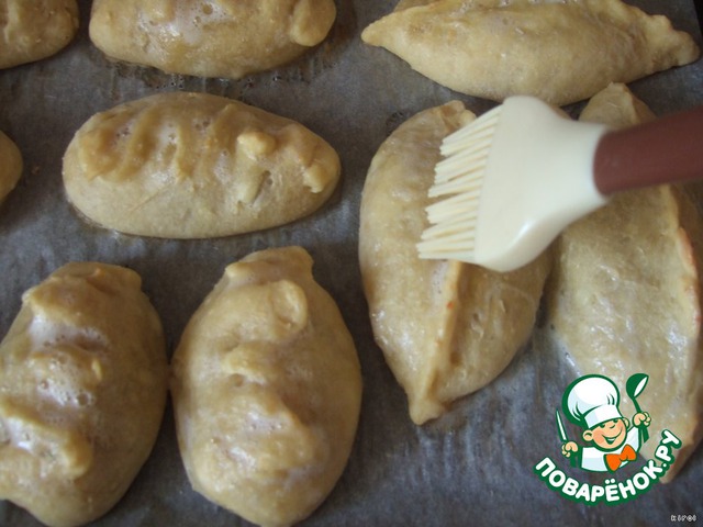 Выкладываем наши кибинайчики на застеленный бумагой (или хорошо смазанный) противень.Выпекать необходимо при температуре 170гр. минут 40-45. После того как наши пирожки попекутся минут 25- их необходимо смазать (хорошо) взбитым белком . Так как начинка сырое мясо жар в духовке не должен быть сильным и время выпечки будет достаточно продолжительное.