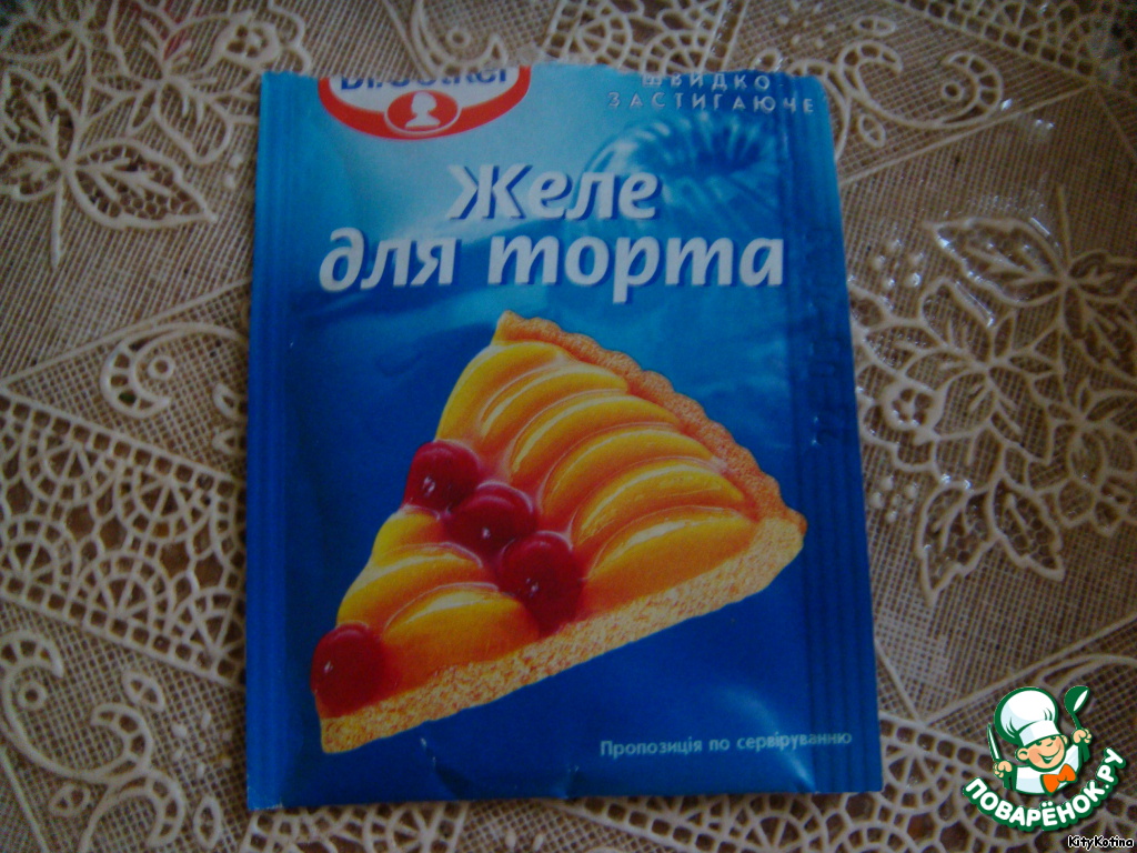 Сверху поливаем желе, которое быстро застывает. Способ его приготовления написан на упаковке. Я использовала такой
