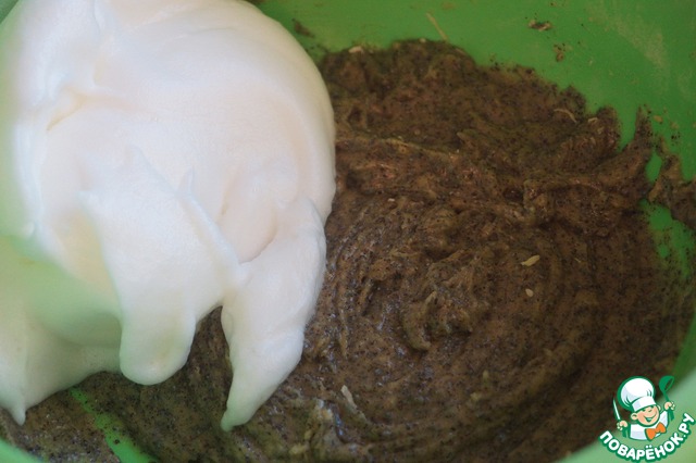 Белки взбить с щепоткой соли в крепкую пену, добавить к массе и аккуратно вмешать белки. Получается тесто, как густая сметана.