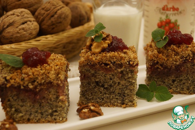 | Очень простой пирог. Невесомый пушистый бисквит с крупинками мака, оттененный кисленьким соусом и дополненный хрустящими орешками - просто идеальный компаньон для стакана молока. Рецепт с сайта "Едим Дома". |