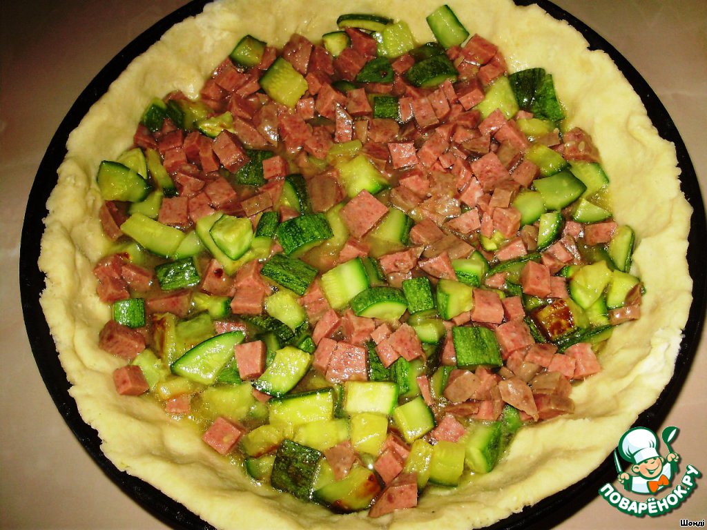 Соединить колбасу, кабачки и яйца вместе, перемешать, посолить.