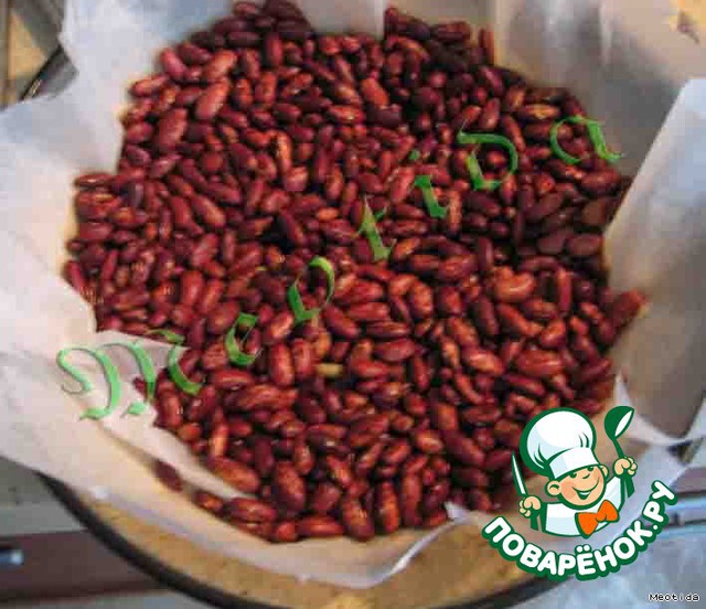 кладем бумагу для выпекания, сверху высыпаем сухую фасоль или горох и отправляем в разогретую до 200С духовку на 20 минут