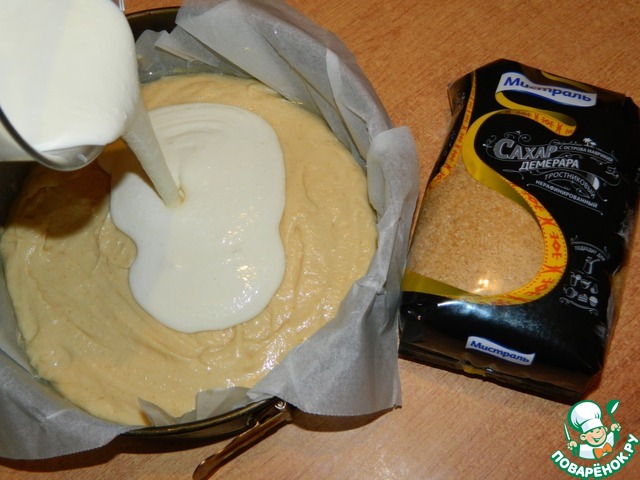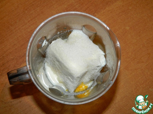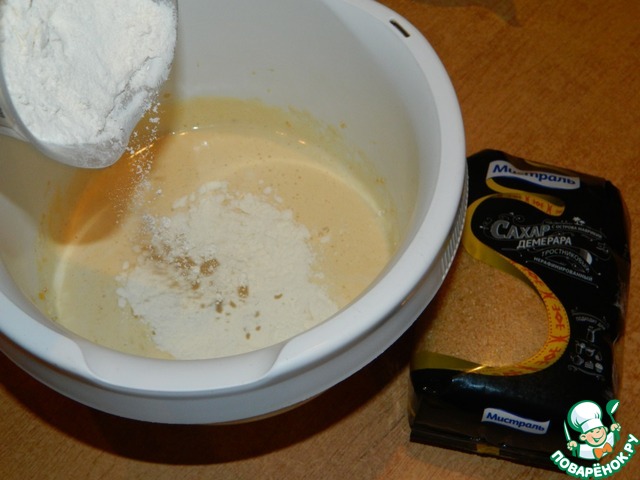Для теста взбить яйцо с тростниковым сахаром Мистраль. Добавить растительное масло, соду, муку, молоко и хорошо перемешать.