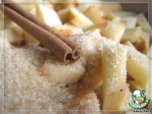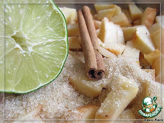 Добавляем коричневый сахар (я добавила мелкий, крупный карамельный оставила для штрейзеля, конечно, можно и одинаковый насыпать), целую палочку корицы и сок 1 лайма. Можно ли заменить лимоном? Можно. Но лайм имеет особый тонкий аромат.