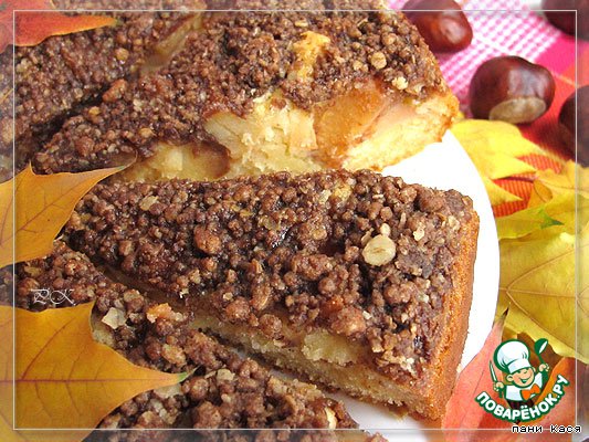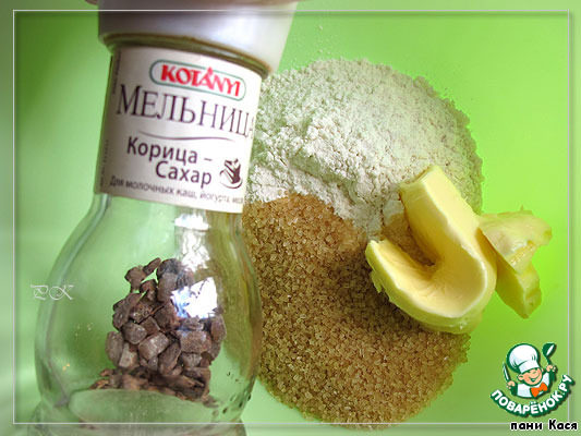 У нас есть 10 минут для штрейзеля. Смешиваем 30 гр. коричневого сахара, 60 гр. муки, 40 гр. мягкого сливочного масла, я добавила еще корицу.