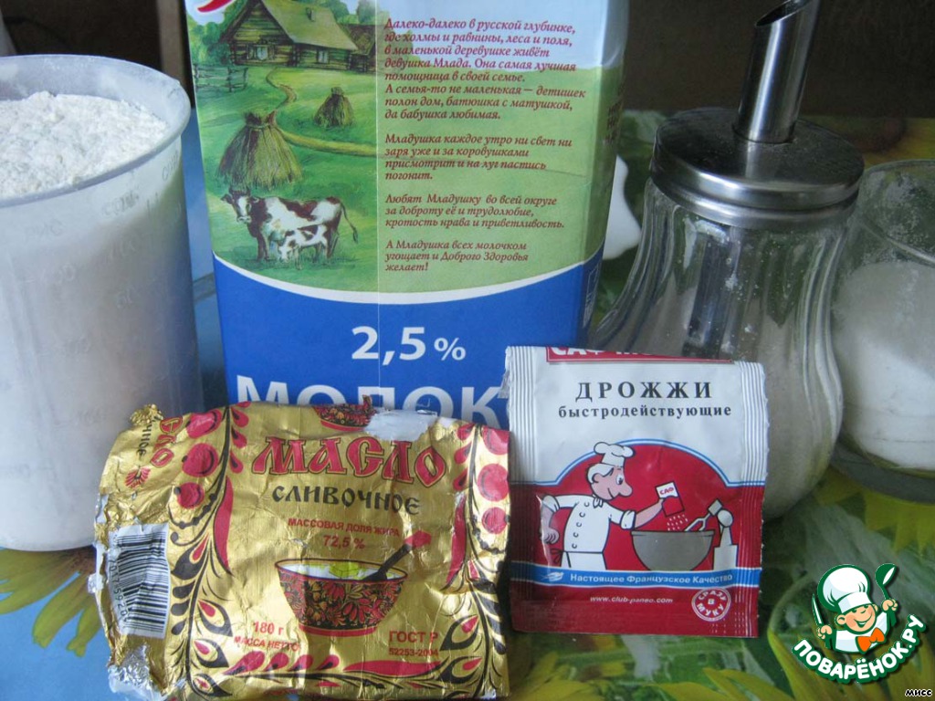 Приготовление пирога начнём с замеса теста. Я этот процесс доверяю хлебопечи. Для приготовления теста нам понадобятся: мука, масло сливочное, вода, молоко, дрожжи, сахар, соль.