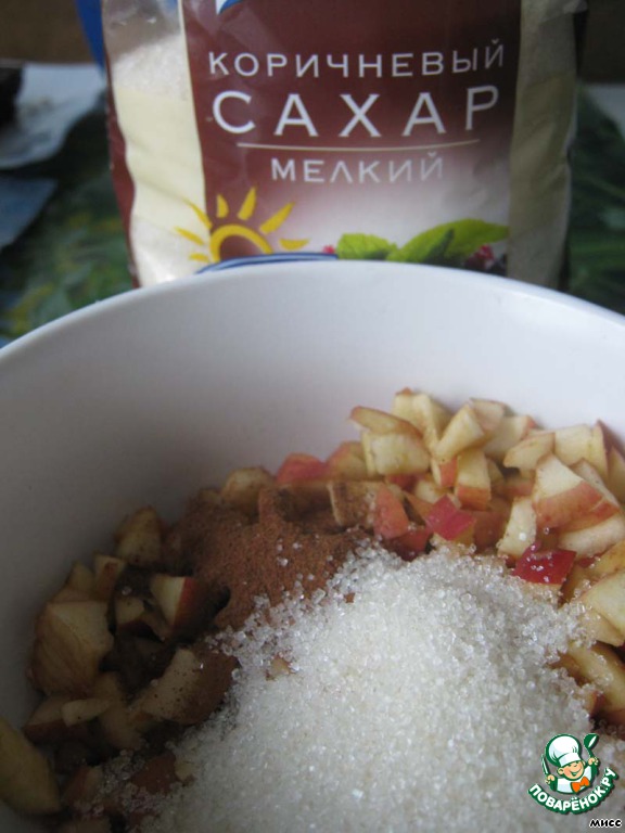 Яблоко очищаем от сердцевины, мелко нарезаем, добавляем корицу, коричневый сахар, дробленные грецкие орехи.