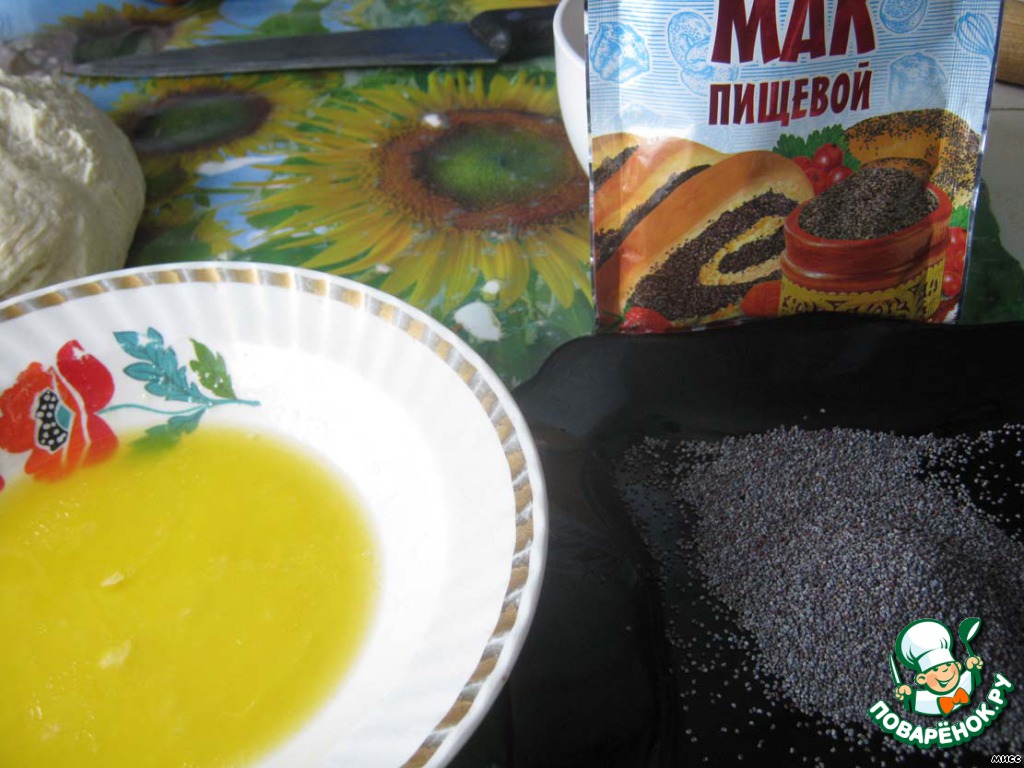 Приготавливаем две ёмкости (тарелочки): одну с растопленным сливочным маслом, другую с маком.
