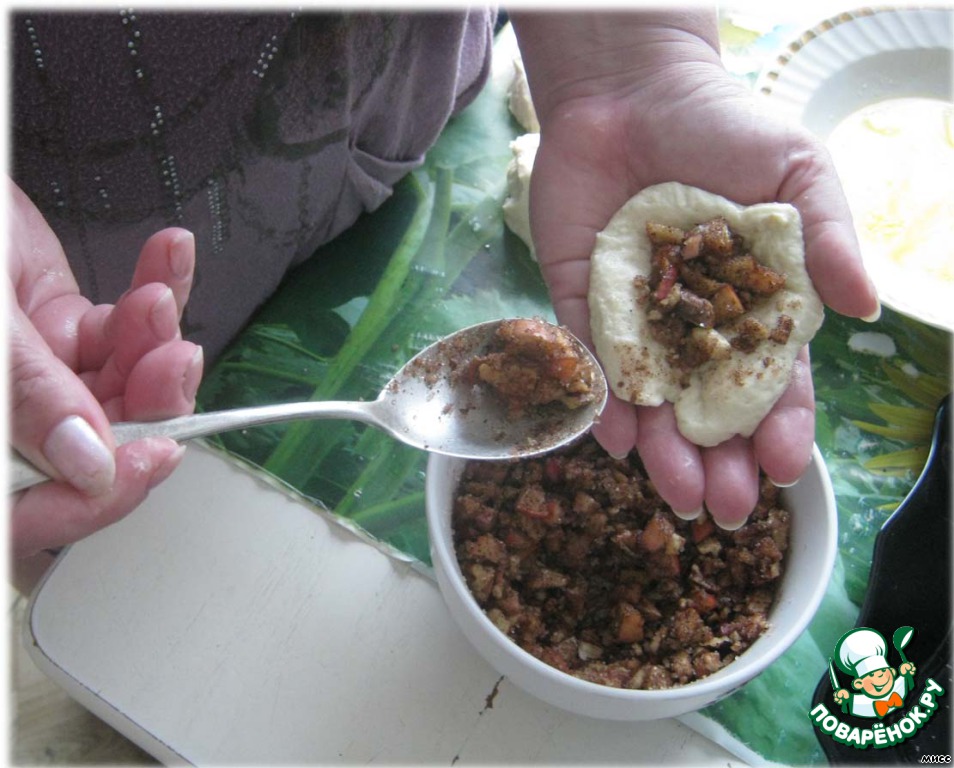 Я не раскатывала тесто, просто руками формировала лепёшку, на середину клала 1 ст. ложку начинки. Защипывала в форме булочки-пирожка.