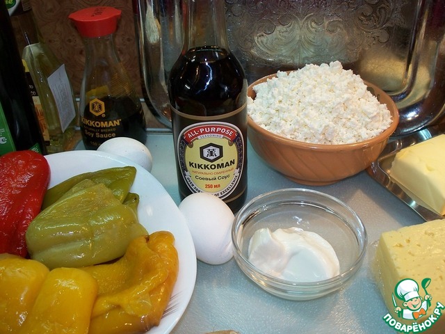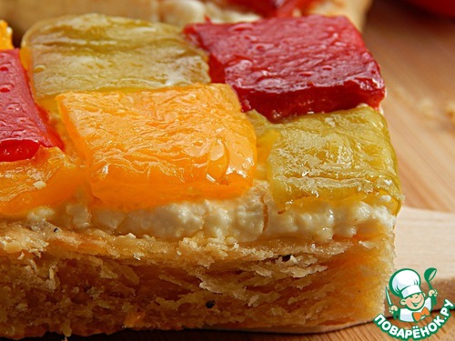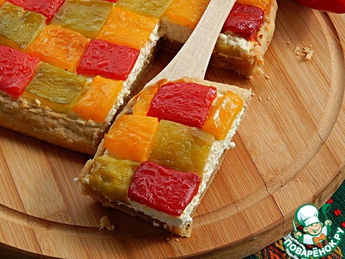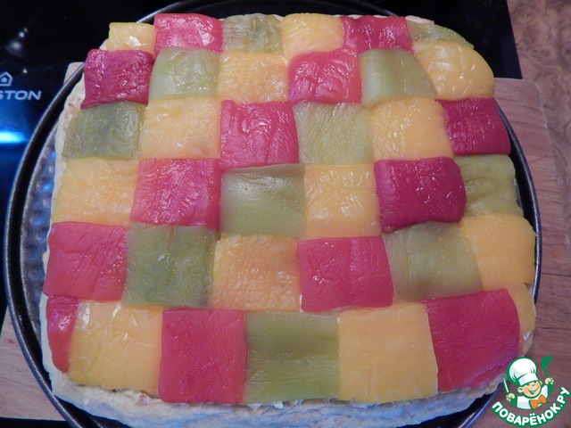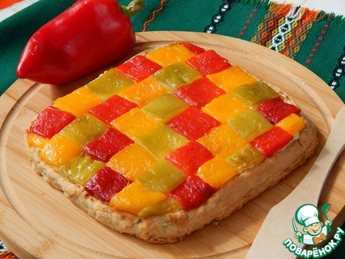 Далее на творог выкладываем нарезанный квадратиками перец, чередуя цвета. Ставим еще раз в духовку минут на 7-10.