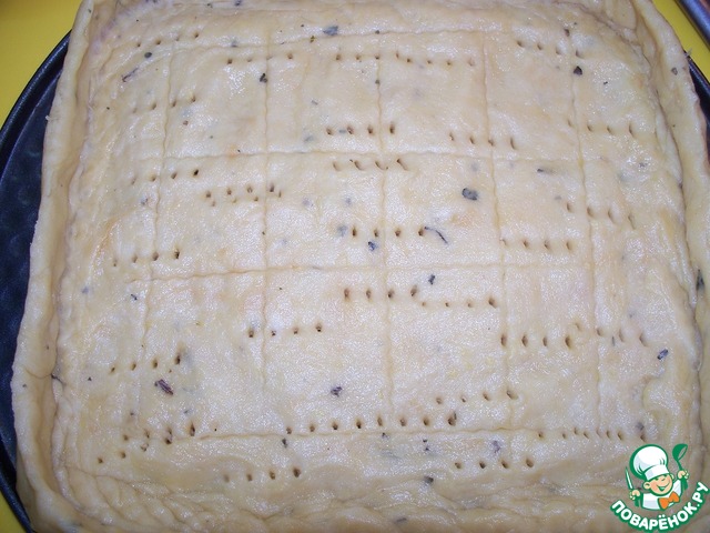 Тесто раскатываем, формируем бортики, накалываем вилкой. Ставим в духовку на 15-20 минут при 190 град.