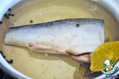 Взяла хвост лосося (в моем случае это кижуч) и отварила в подсоленной воде с лавровым листом и черным перцем-горошком. Так как пирожки будут крошечные и пекутся моментально, то я решила не пользоваться для фарша сырой рыбой.