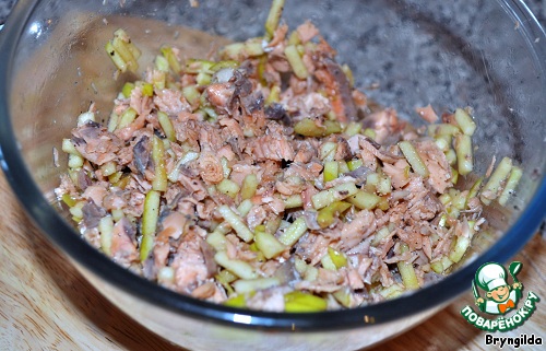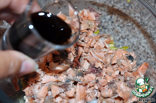 Отваренную рыбу отделила от костей и тоже мелко порезала и смешала с соевым соусом kikkoman классический, рыба его сразу впитала.
