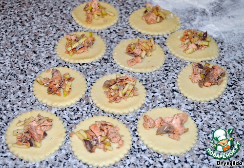 Раскатала тесто и формочкой для печенья вырезала кружочки диаметром не более 5 см, заполнила фаршем и слепила пирожки.